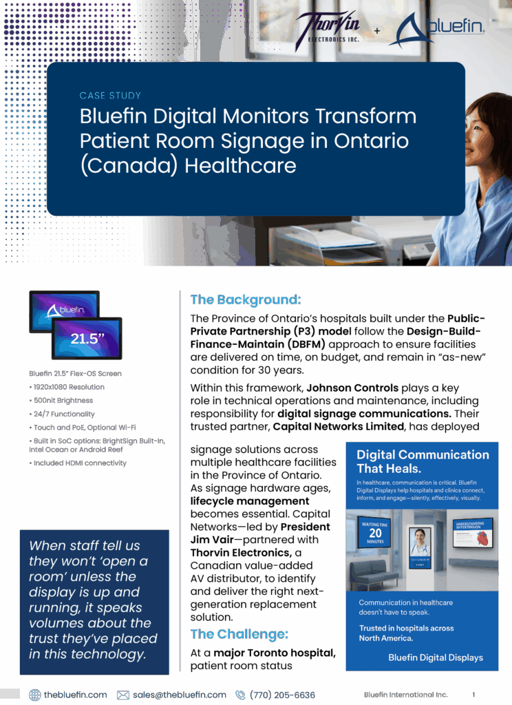 The Province of Ontario’s P3 hospitals follow the Design-Build-Finance-Maintain model to ensure facilities remain in “as-new” condition for 30 years. As part of this mandate, Johnson Controls oversees technical operations—including digital signage—supported by Capital Networks, whose Audience™ CMS provides the reliable, centralized communication framework needed across healthcare environments. At Humber River Hospital in Toronto, aging signage hardware prompted a lifecycle upgrade, leading Capital Networks to partner with Thorvin Electronics to identify the next-generation replacement platform.