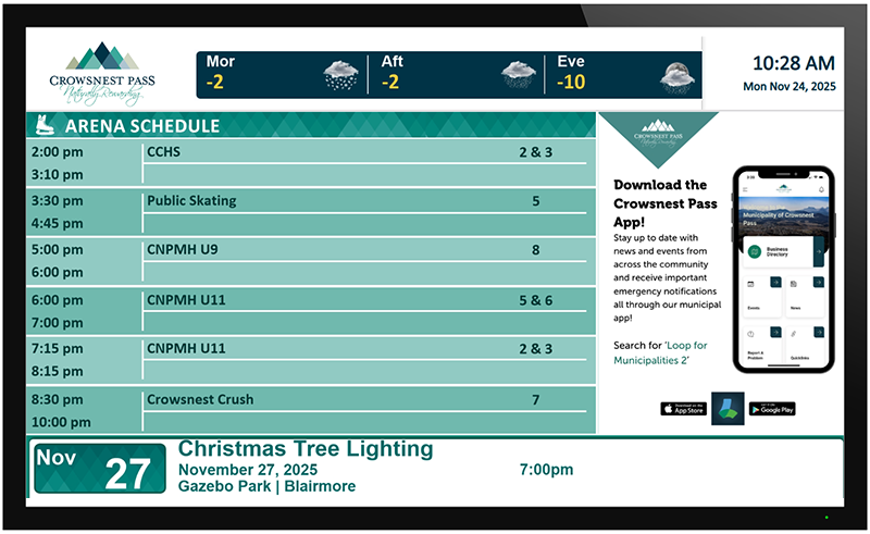 The Municipality of Crowsnest Pass has modernized its recreation facility communications with the deployment of the Audience™ digital signage platform from Capital Networks, delivering a more efficient and dynamic way to share real-time scheduling, facility information, and municipal updates.